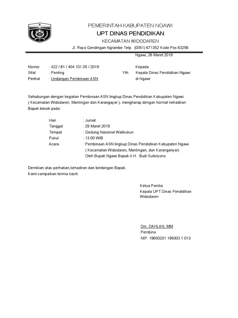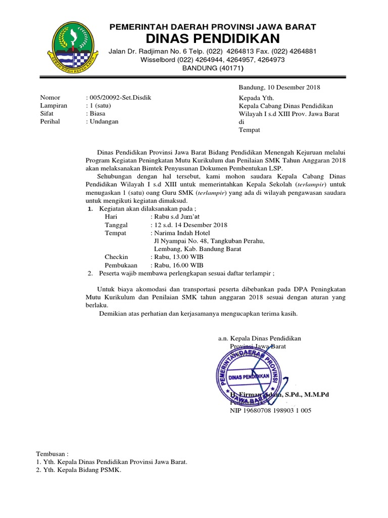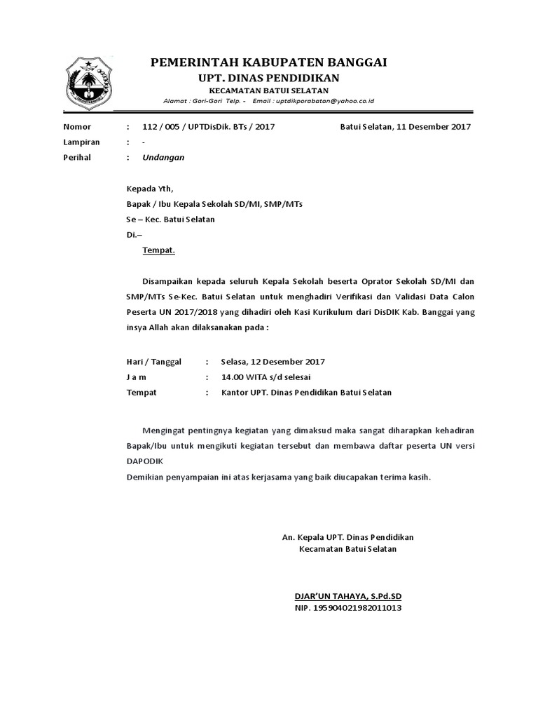 Contoh Surat Undangan Untuk Kepala Dinas Pendidikan / Surat Undangan Untuk Kepala Sekolah Pigura - Surat dinas adalah surat yang bersifat resmi dan dibuat oleh instansi pemerintah maupun swasta untuk kepentingan yang bersifat kedinasan.. Surat dinas bisa dijadikan sebagai sebuah pedoman untuk melakukan suatu pekerjaan tertentu, seperti penulisan surat memiliki susunan surat yang resmi, atau baku, ditandai dengan adanya kepala surat atau kop surat yang disertai dengan. Keputih gg.3 no 999 sukolilo. Maka sangat penting untuk mempelajari dan mengetahui cara pembuatannya. Surat dinas sekolah merupakan surat resmi yang dikeluarkan oleh pihak sekolah yang ditujan kepada orang tua maupun wali mudrid. Surat dinas atau surat resmi merupakan surat yang digunakan untuk menunjang kegiatan pentingan pekerjaan formal.